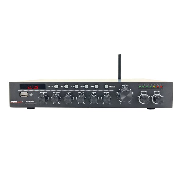 Master Audio MY21200 este un amplificator audio cu Media Player BLUETOOTH/USB/SD, ce dispune de o putere totala de 120W, distribuita pe 2 zone cu control independent de volum. Avand 2 intrari de microfon si o intrare de linie auxiliara, MY2120 este ideal pentru toate aplicatiile de sonorizare ambientala sau Public Address, unde este nevoie de o distribuire pe zone a sunetului.